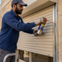 فني يقوم تزييت مجرى الشتر بشكل صحيح بواسطة علبة رذاذ على الأرض.